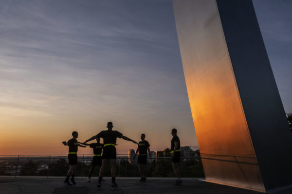 Soldiers from Joint Base Myer-Henderson Hall work out underneath the Air Force Memorial on Tuesday, Sept. 3, 2019 in Arlington. (Staff Photo by Jay Westcott)