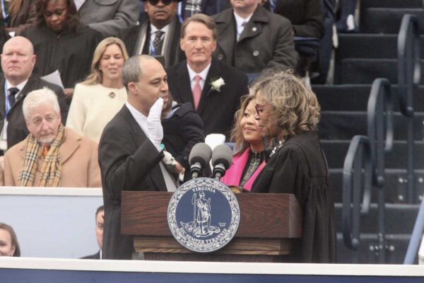 Jay Jones is sworn in as Virginia Attorney General by the Hon. Lyn M. Simmons, chief judge of the Norfolk Juvenile and Domestic Relations District Court, Jan. 17, 2026 (staff photo by James Cullum)