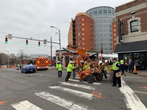 The crash happened shortly after 2 p.m. at the intersection of Wilson Blvd and Washington Blvd, which is currently under construction as part of the Clarendon Circle intersection improvement project. Tire tracks are visible on the road where the driver entered the intersection before coming to a stop across from Asiatique restaurant.