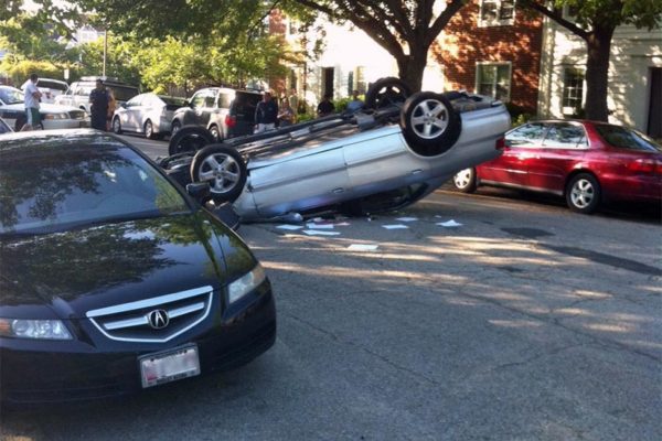 (Updated at 9:20 a.m.) A car flipped on its roof near Shirlington on Sunday after colliding with a parked police car.
